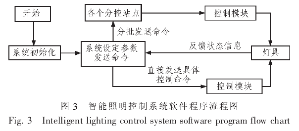 智能照明控制系统软件程序流程图如图3所示,可以看到,该系统每次开始后,首先进行初始化,然后发送要设定的参数命令,来设定这次系统的值,之后根据命令的种类,发送给相应的部分。反馈状态信息主要是依据传感器传回的外部信息,从而更好的手动调整照明值等参数。
